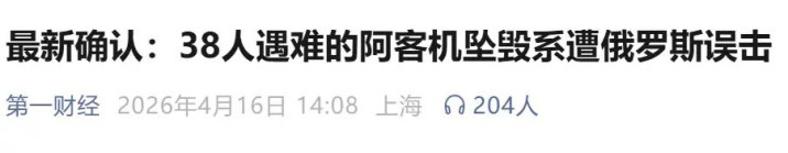 根据2026年4月16日最新传来的消息,俄罗斯与阿塞拜疆两国外交部共同发布的联合声明,终于把这起空难事件彻底盖棺定论。那架搭载着足足69名人员、在空中正常飞行途中意外坠毁的阿塞拜疆民航客机,已经明确证实是被俄罗斯的防空系统误击击落,最终一共有38名无辜人员不幸遇难。